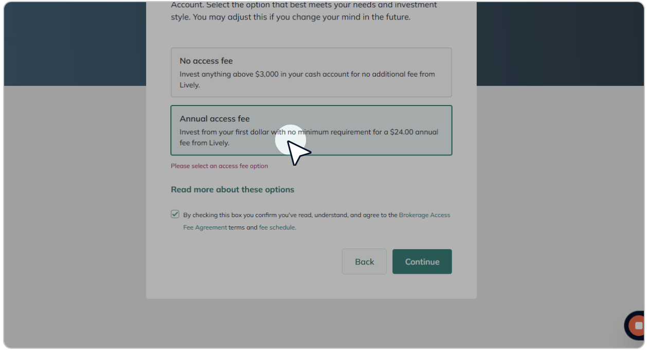 Choose either the "No access fee" or "Annual access fee" option. Because the Lively $24 is relatively minor and allows you to invest $3,000 more into your portfolio, for clients who wish to primarily invest their HSA balance (as opposed to those who wish to reserve some cash for medical expenses) we reccomend the "Annual access fee" option.