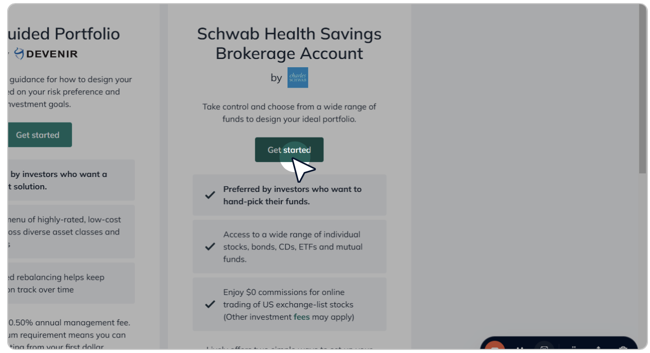 - From the Investments screen, click on “Get started” for the Schwab Health Savings Brokerage Account option.